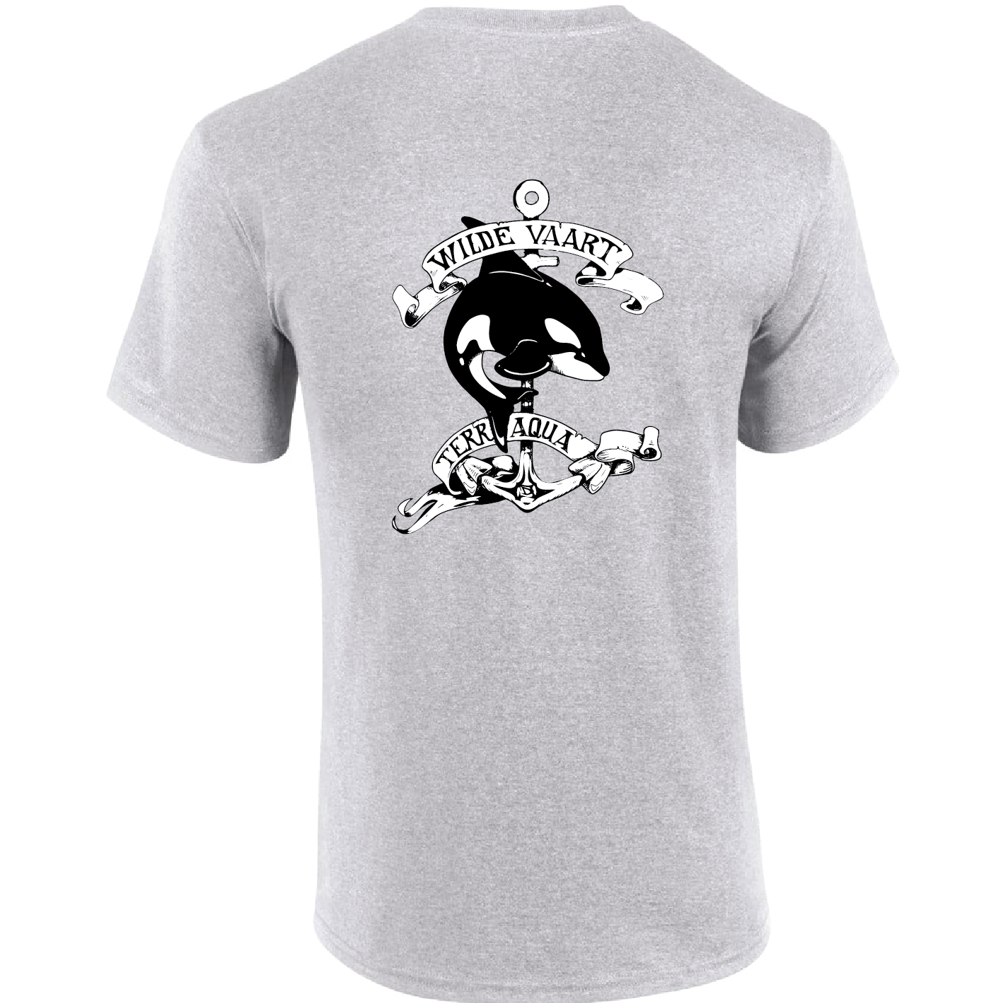 Achterzijde het Wilde vaart logo en de linker borst het groepslogo.